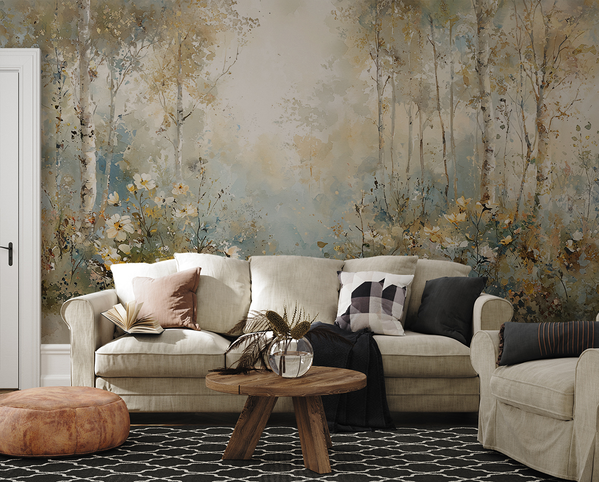 Muurschildering “Forest Harmony in Watercolour” – subtiele elegantie, schilderachtige lichtheid en nabijheid tot de natuur in je interieur