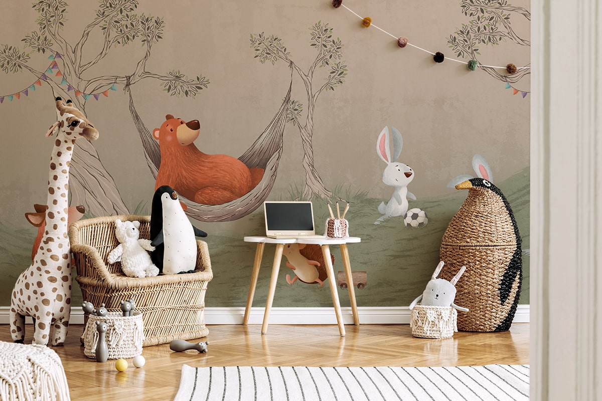 Verander de kinderkamer in een charmant hoekje vol avonturen en bosmagie met het fotobehang “Bosavontuur van Vrienden”. Deze subtiele, met de hand geïllustreerde scène toont vriendelijke dieren – een teddybeer in een hangmat, konijntjes die met een bal spelen, een nieuwsgierige vos en een vrolijke egel – die samen tijd doorbrengen in een sprookjesbos.