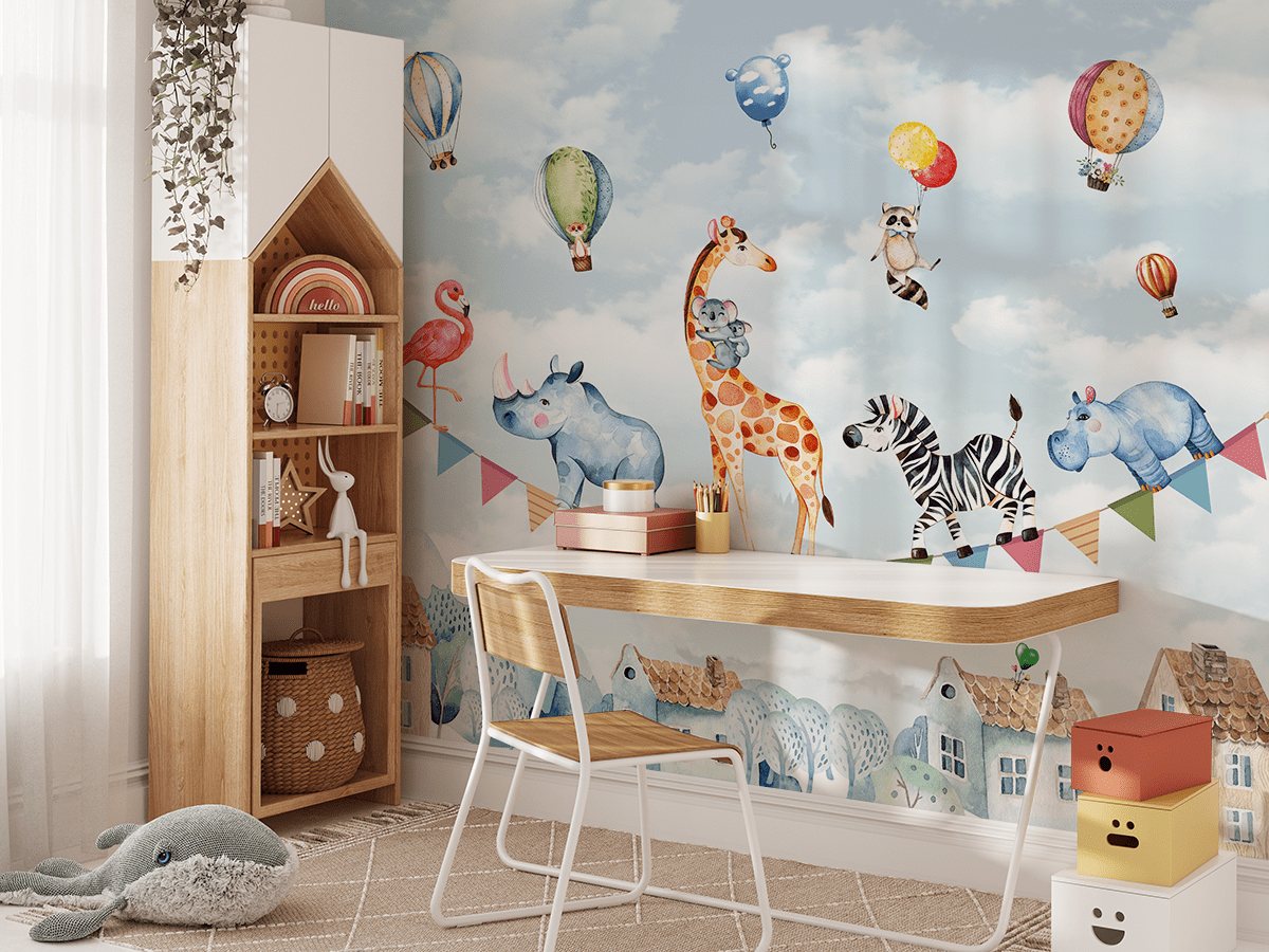 Creëer een unieke sfeer in de kinderkamer met het fotobehang “Balancing Safari”. Deze charmante, kleurrijke illustratie toont vriendelijke dieren – een giraffe, een zebra, een neushoorn en andere – die spelen op een touw met vrolijke vlaggen en ballonnen die zweven tegen een helderblauwe hemel. Deze scène, vol warmte en fantasie, zal de verbeelding van een kind prikkelen en vreugde en rust in huis brengen.