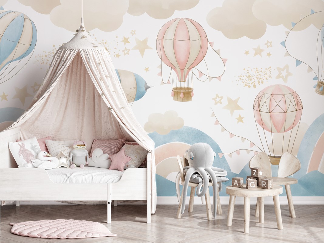 Het fotobehang “Ballonvlucht in de Wolken” is een unieke wanddecoratie die een gevoel van vrijheid, lichtheid en dromerig avontuur in uw interieur brengt. De compositie toont ballonnen die zweven tussen zachte, pluizige wolken, subtiel verlicht door regenboogstralen. De lichtheid en het pastelkleurenpalet creëren een rustgevende, sfeervolle achtergrond – perfect voor een kinderkamer. Dit fotobehang is voor wie waarde hecht aan esthetisch minimalisme gecombineerd met een vleugje vrijheid – het brengt een aura van optimisme, ruimte en een dromerige sfeer in uw interieur.