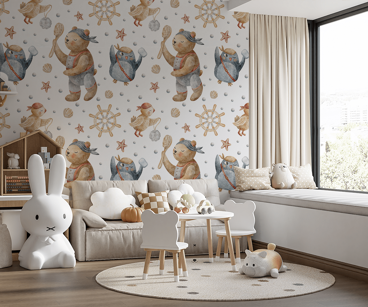 Breng een vleugje fantasie en zeeavontuur in de kamer van je kleintje met het “Sea Pranksters Crew” fotobehang. Dit charmante, handgeschilderde patroon toont vriendelijke piratendieren – een teddybeer, een pinguïn en een vogel – die samen een onderwaterwereld vol schelpen, zeesterren en roeren ontdekken. Warme kleuren, zachte aquareldetails en vriendelijke personages geven het interieur een sprookjesachtig karakter en gezelligheid.