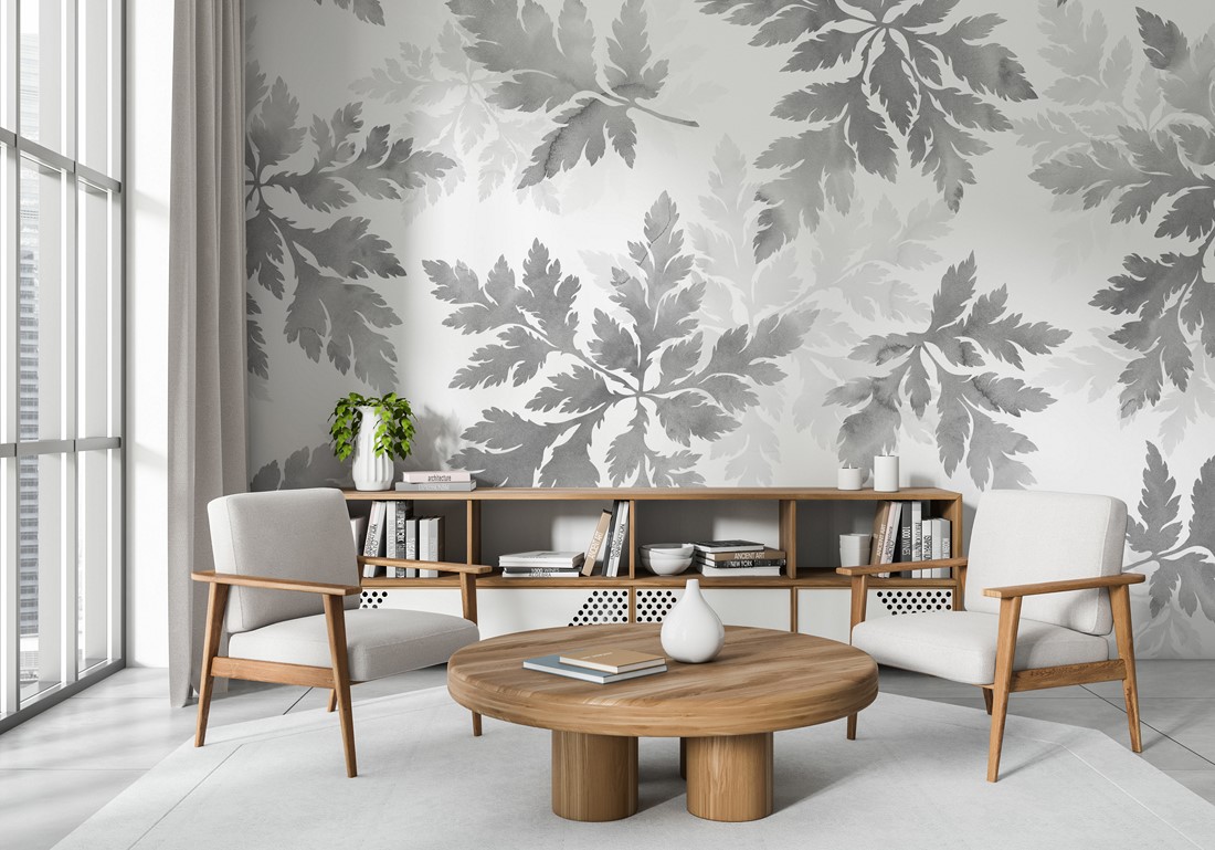 Fotobehang “Bladeren in grijstinten” is een elegante wanddecoratie die rust, harmonie en subtiele esthetiek in het interieur brengt. Het bladmotief, uitgevoerd in ingetogen grijstinten (grijze en witte bladeren op een neutrale achtergrond), creëert een minimalistisch natuureffect – perfect voor Scandinavische, loft- of moderne interieurs. De afbeelding kenmerkt zich door subtiliteit en verfijnde rust: bladeren die als door mist worden bekeken en zich op delicate wijze schikken in een kalm patroon dat optische diepte en elegantie introduceert. Dankzij de ingetogen kleuren is dit fotobehang geschikt voor zowel woonruimtes – woonkamers en slaapkamers – als kantoorruimtes, waar neutrale achtergronden en een minimalistische stijl de boventoon voeren. Het ontwerp, gebaseerd op een natuurlijk bladmotief, maakt het interieur gezellig en tegelijkertijd modern. Dit behang is een aanrader voor wie waarde hecht aan de tijdloze elegantie van decoratie en de veelzijdigheid ervan, waardoor het perfect harmonieert met meubels in hout-, metaal- of betontinten.