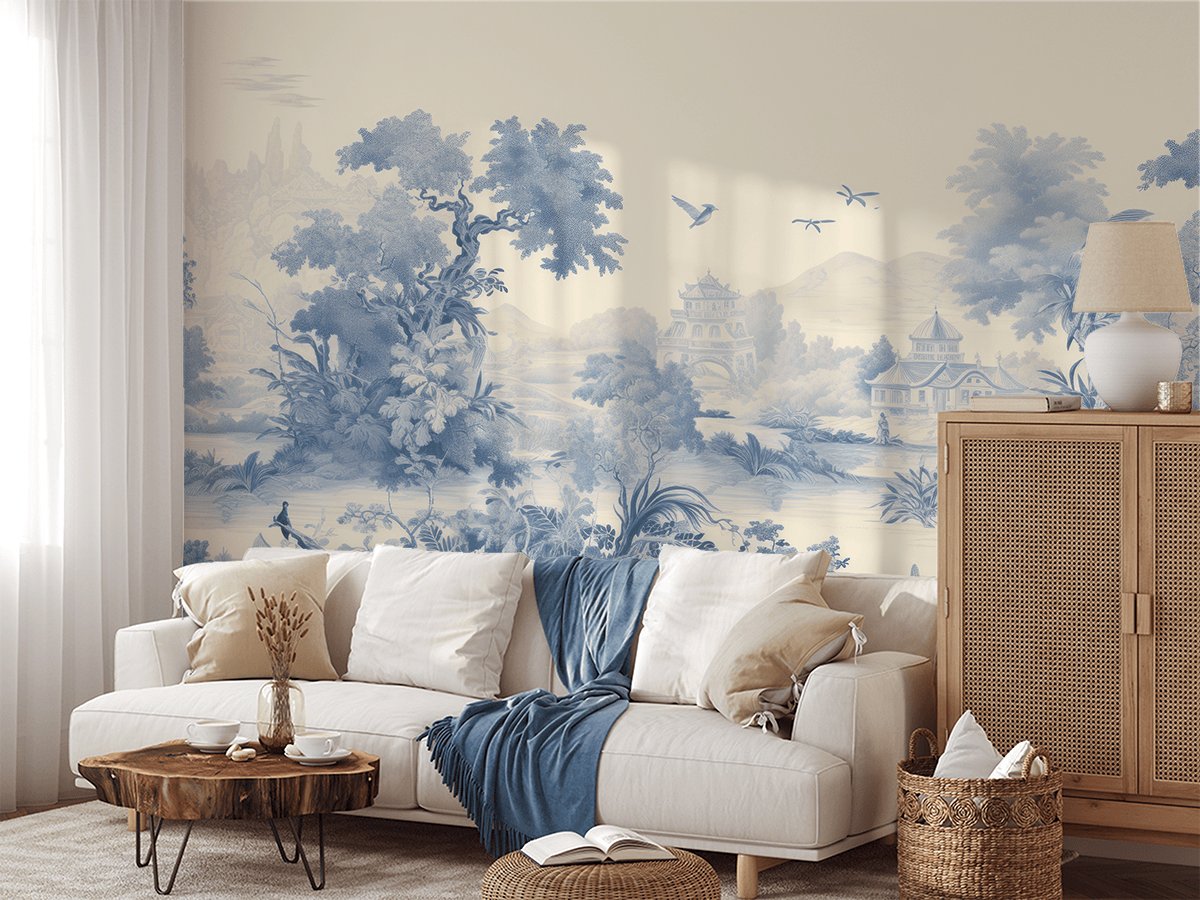 Creëer een unieke sfeer in uw huis met het fotobehang “Blauwe Oase van Vrede”. Dit subtiele, blauwe landschap, geïnspireerd op klassieke Aziatische gravures, creëert een sfeer van rust en kalmte en past perfect bij zowel moderne als traditionele interieurs. De gedetailleerde weergave van planten, vogels en architectuur geeft de ruimte een verfijnd, artistiek karakter.