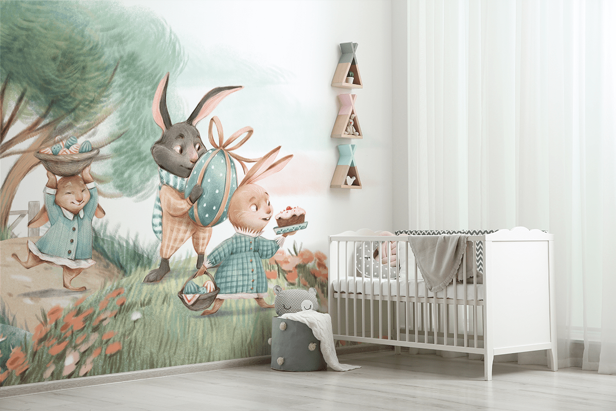 Creëer een unieke sfeer in de kamer van je kleintje met het fotobehang “Happy Bunnies”. Dit energieke, lenteachtige patroon toont vrolijke konijntjes die spelen tegen een achtergrond van bloemen en groen, waardoor een ruimte vol vreugde en kleur ontstaat. Fijne details en levendige kleuren geven het interieur een vriendelijk en optimistisch karakter, perfect voor kinderen.