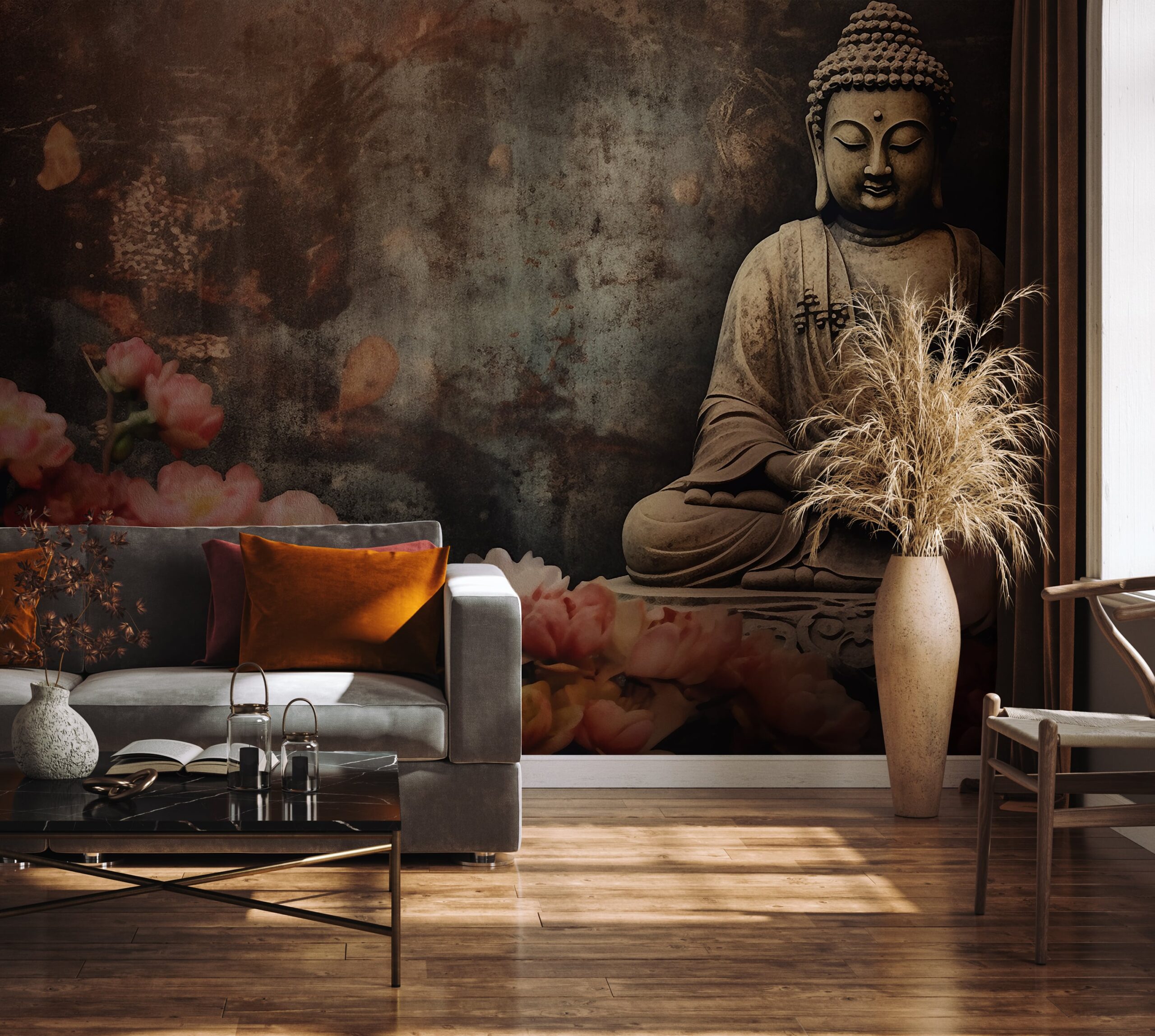 Breng een unieke sfeer in huis met het “Bloeiende Meditatie” fotobehang. Deze zorgvuldig samengestelde compositie toont een Boeddhabeeld omringd door delicate, bloeiende bloemen die een sfeer van vrede en evenwicht creëren. De ingetogen kleuren en het evenwichtige patroon passen perfect in zowel moderne als klassieke interieurs.