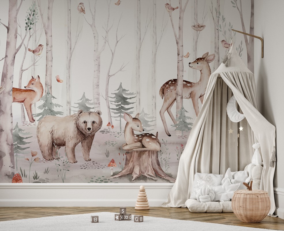 De “Bosdieren in een zacht landschap” fotobehang toont een charmante, vredige natuurwereld, perfect voor een kinderkamer. De afbeelding toont verschillende bosdieren – reeën, beren, vossen, uilen – in een harmonieus, pastelkleurig boslandschap dat tederheid, warmte en rust uitstraalt. Dankzij de subtiele kleuren en zorgvuldig vormgegeven illustraties brengt dit behang een sprookjesachtige bossfeer en natuurlijke elegantie in uw interieur. Dit is een perfecte keuze voor wie waarde hecht aan een combinatie van gezelligheid, inspirerende natuur en minimalistische stijl. Het behang “Bosdieren in een delicaat landschap” past goed in Scandinavische, boho en moderne interieurs en voegt leven, een zachte esthetiek en subtiele diepte toe.