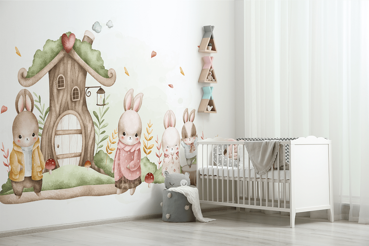 Breng een warme en vrolijke sfeer in de kinderkamer met de illustratie “Boskonijnenfamilie”. Deze delicate, pastelkleurige afbeelding toont vriendelijke konijntjes naast een gezellig huisje in het bos, wat een magische sfeer creëert voor de fantasie van kinderen. Subtiele details en zachte kleuren passen perfect in elk kinderinterieur en brengen rust en een glimlach.