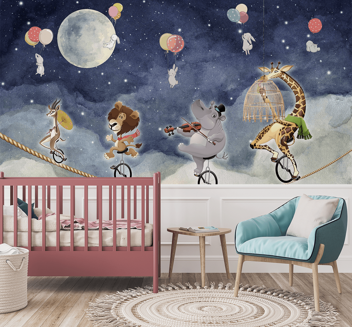 Een fotobehang is meer dan alleen decoratie – het is een toegangspoort tot een fantastische wereld waar elke nacht een circusavontuur boven de wolken kan worden.