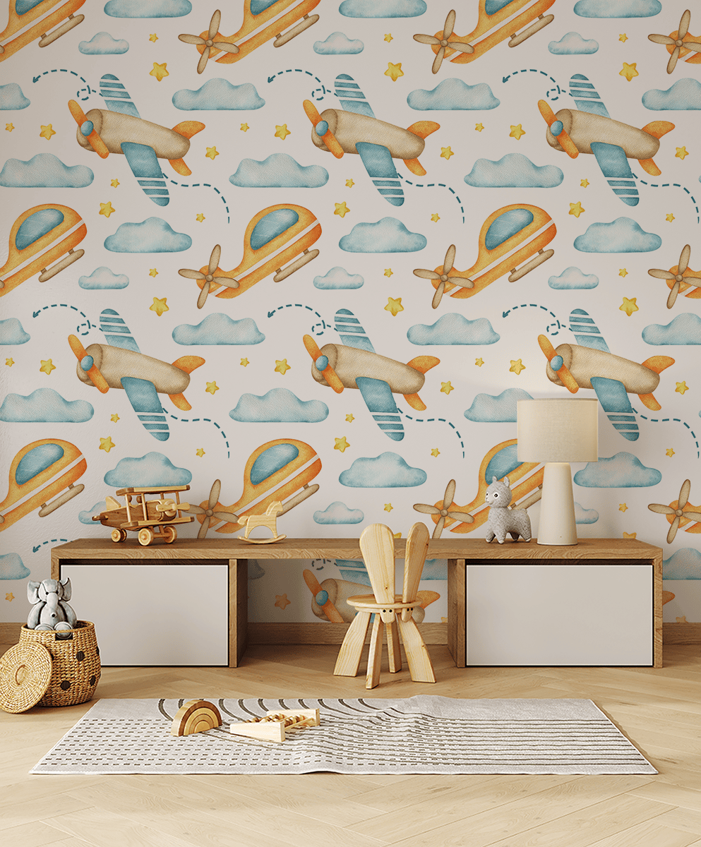Creëer een magische sfeer in de kinderkamer met het fotobehang “Cloud Flights”. Deze charmante aquareltekening met vliegtuigen, zachte wolken en sterren neemt je kleintje mee naar een wereld van zorgeloze vluchten en dromen over de hemel. Heldere, warme kleuren en delicate details creëren een ruimte vol vreugde en fantasie, perfect voor een kinderkamer of speelhoek.