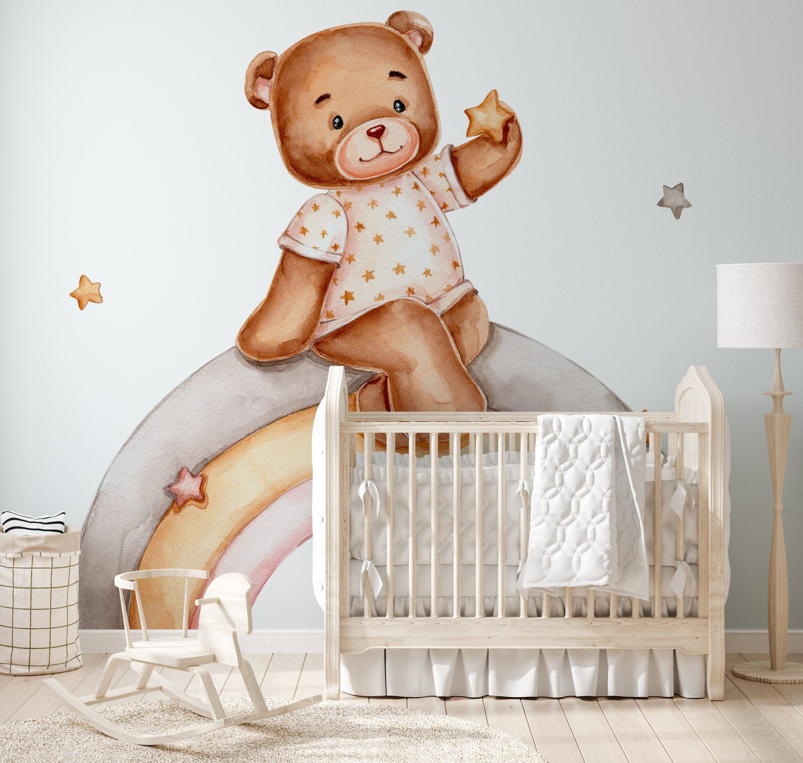 Breng een vleugje magie en vreugde in huis met het “Regenboog Teddybeer Wereld” fotobehang. Dit charmante, kleurrijke patroon toont een teddybeer op reis over een betoverde regenboog, die de ruimte verlicht met warmte en optimisme. Kleurrijke wolken, sterren en regenbogen creëren een sprookjesachtige sfeer, perfect voor een kinderkamer.