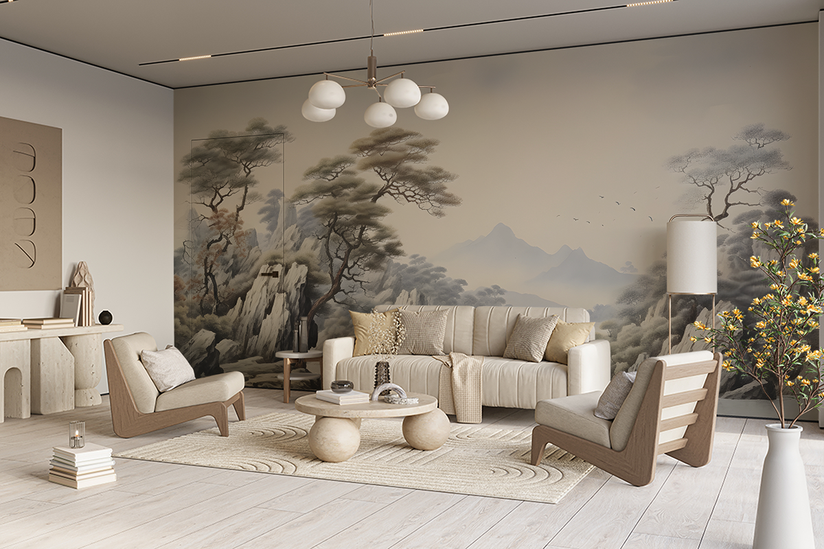Breng de kalmerende sfeer van de natuur in uw interieur met het fotobehang “De Vrede van de Mistige Heuvels”. Het delicate landschap van bergen en bomen gehuld in mist creëert een unieke compositie vol zachtheid en reflectie. Subtiele kleurovergangen en zachte contouren geven de ruimte een uniek, bijna meditatief karakter.