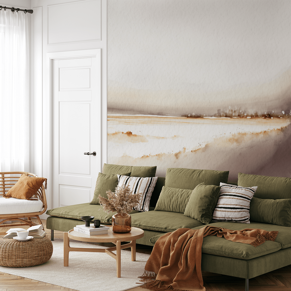 Breng een sfeer van rust en contemplatie in uw interieur met het fotobehang “Morning Silence”. Dit aquarellandschap in warme, ingetogen tinten beige, bruin en grijs legt de delicate schoonheid vast van het ochtendlicht boven een kalme kust. De minimalistische vorm en zachte kleuren creëren een unieke sfeer van rust en reflectie.
