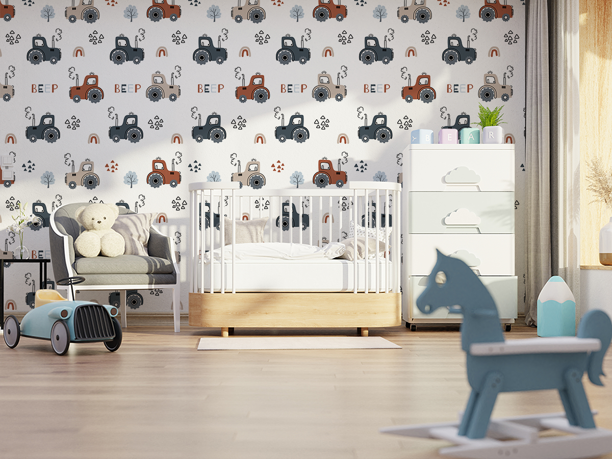 “De Vrolijke Machine” tovert de kinderkamer om tot een unieke plek waar het dagelijks leven een spannende reis wordt en elke dag nieuwe ontdekkingen brengt. Een fotobehang met een tractormotief is een tijdloze keuze voor ouders die een interieur willen creëren vol vreugde, positieve energie en de verbeelding van een kind. Het is een combinatie van leren, plezier en een charmante stijl in één.