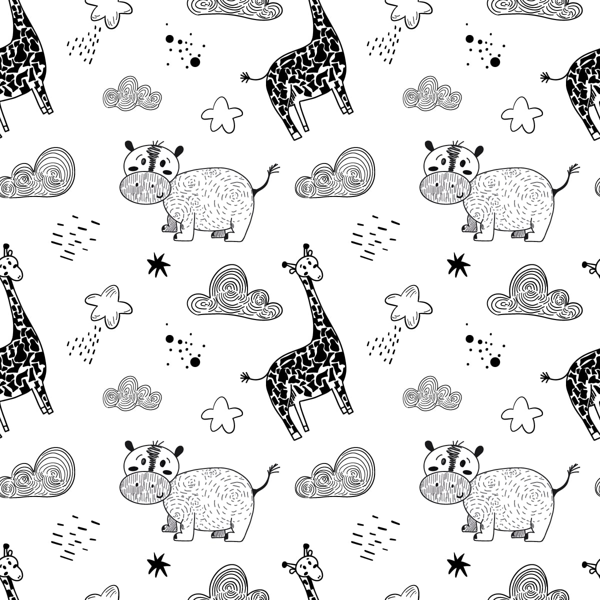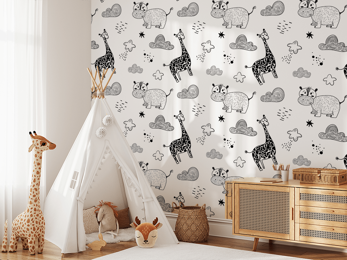 Breng een magische sfeer in je interieur met het fotobehang “Dieren in de Wolken”. Dit charmante zwart-witpatroon met afbeeldingen van giraffen en nijlpaarden, omringd door wolken en sterren, creëert een vrolijke en sprookjesachtige sfeer in je huis. Fijne lijnen, speelse figuren en subtiele kleuren zijn perfect voor kinderkamers, kleuterscholen en ruimtes vol fantasie.