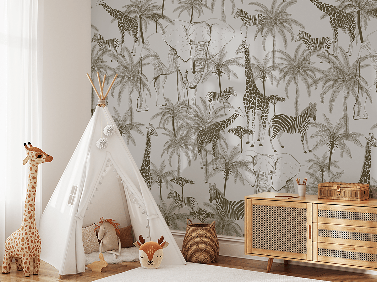 Breng een unieke sfeer in de kamer van uw kleintje met de muurschildering “Dieren onder de palmbomen”. Dit kleurrijke patroon, vol tropische dieren zoals zebra’s, giraffen en olifanten, genesteld tussen exotische palmbomen, creëert een sfeer vol vreugde en avontuur. Vrolijke dierenfiguren en intense kleuren geven energie aan de ruimte en vrolijken iedereen op die de kamer binnenkomt.