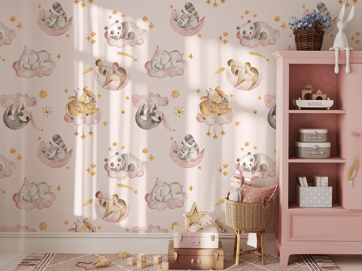 Creëer een unieke sfeer in de kinderkamer met het “Animal Dreams” fotobehang. Dit delicate pastelpatroon toont slapende dieren op roze wolken en manen, waardoor een sfeer van warmte, veiligheid en rust ontstaat. Charmante motieven en zachte kleuren zorgen ervoor dat elk kind zich in een sprookjeswereld waant.