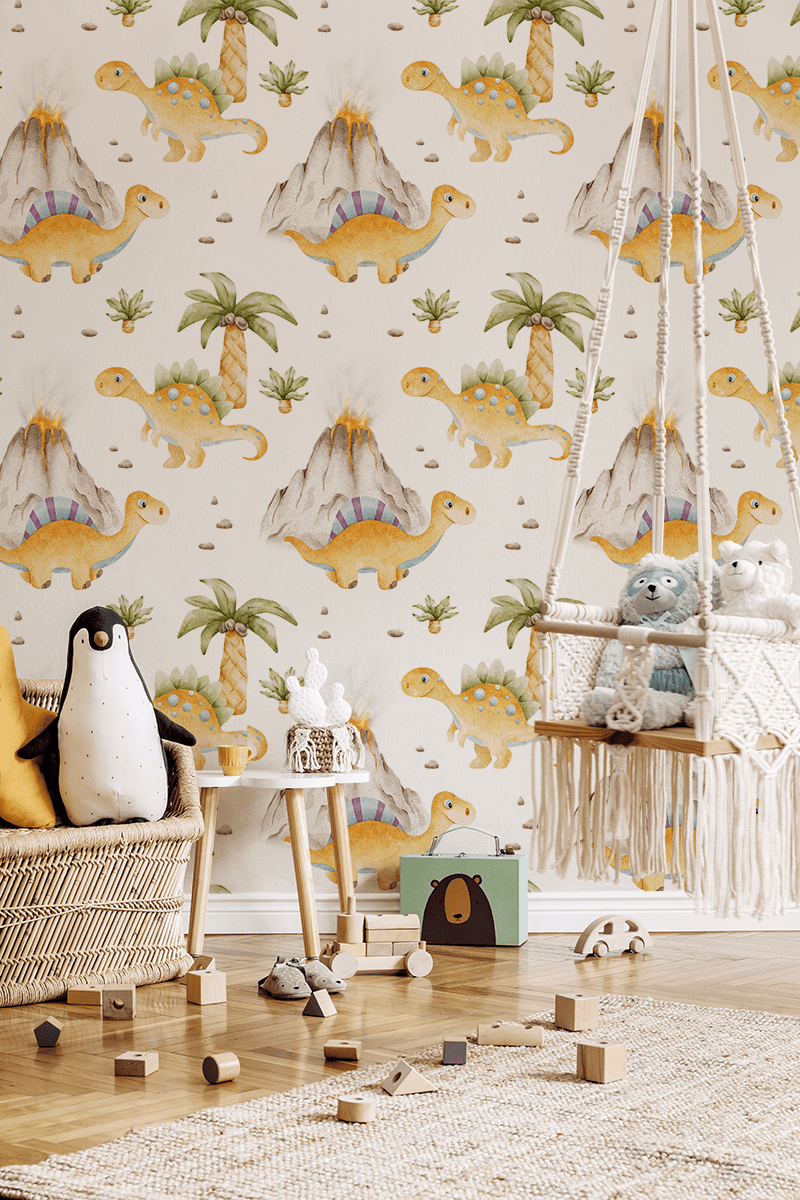 Breng een magische wereld naar de kinderkamer met de muurschildering “Dinosaurussen uit Vulkaanland”. Dit charmante, pastelkleurige patroon met vrolijke dinosaurussen en een actieve vulkaan prikkelt de fantasie en creëert een vriendelijke, vrolijke sfeer. Zachte kleuren en leuke vormen zijn perfect voor kinderkamers, kleuterscholen en speelruimtes.