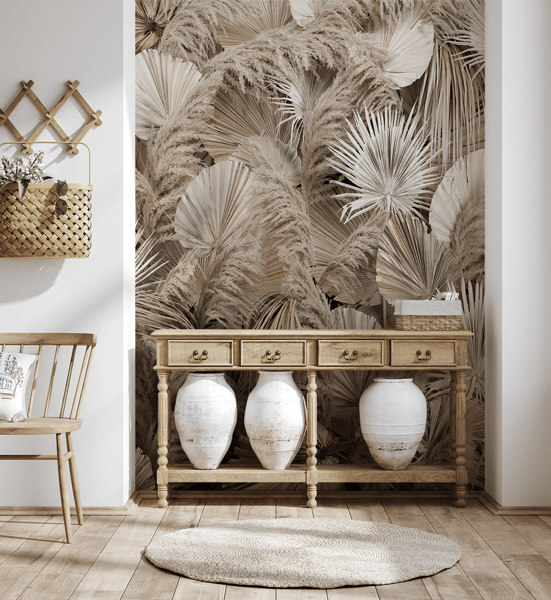 Breng de rust, warmte en lichtheid van de natuur in uw interieur met het “Dry Elegance” fotobehang. Dit delicate patroon, geïnspireerd op gedroogde palmbladeren en pampasgras, straalt een organische esthetiek en een ingetogen beige kleurenpalet uit. De compositie verrast met zijn subtiele textuur en harmonie van vormen, waardoor een sfeer van rust en natuurlijke schoonheid ontstaat.