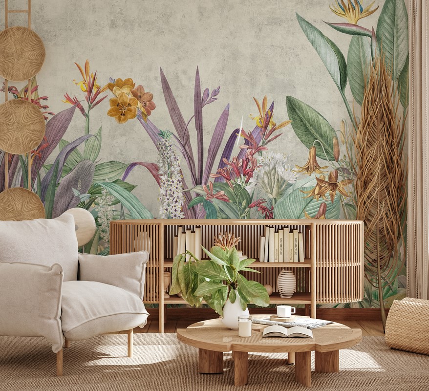De Exotische Bloemen en Bladeren muurschildering is een decoratie die tropische energie, weelderige vegetatie en artistieke verfijning in uw interieur brengt. Gestileerde exotische bloemen en bladeren creëren een intense, kleurrijke compositie vol details en natuurlijke intensiteit. Perfect voor een woonkamer, eetkamer, badkamer of kleedkamer – het brengt een aura van zomerse frisheid, elegantie en een inspirerende tropische esthetiek. De muurschildering “Exotische Bloemen en Bladeren” is een aanrader voor wie waarde hecht aan plantenaccenten, energieke arrangementen en een natuurlijk, artistiek ontwerp – perfect voor het creëren van interieurs vol leven en stijl.