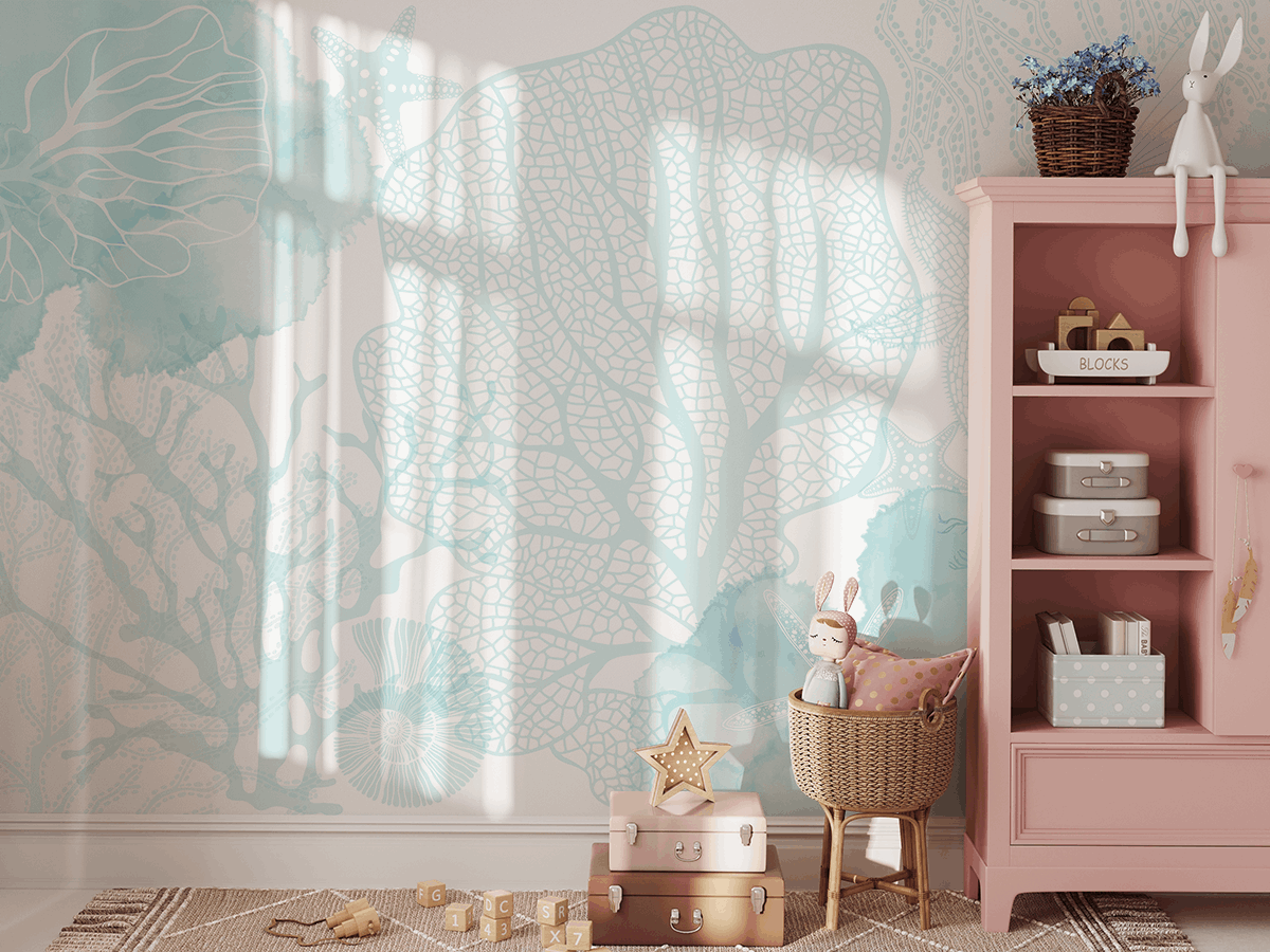 Breng een unieke sfeer in huis met het fotobehang “Geheimen van de Oceaan”. Dit subtiele aquarelpatroon, geïnspireerd op koraalriffen en zeevegetatie, neemt je mee naar de magische diepten van de oceaan en voegt frisheid en harmonie toe aan de ruimte. Delicate blauwtinten en de subtiele details van koraal en zeesterren creëren een compositie die perfect past in moderne, Scandinavische en klassieke interieurs.