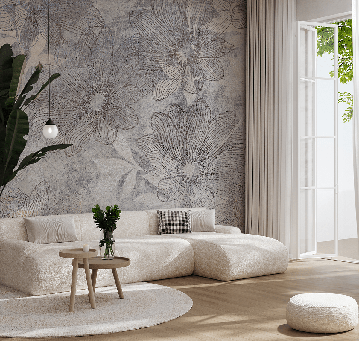 Fotobehang “Grijze Bloemen” – subtiele elegantie, artistieke vorm en bloemenrust