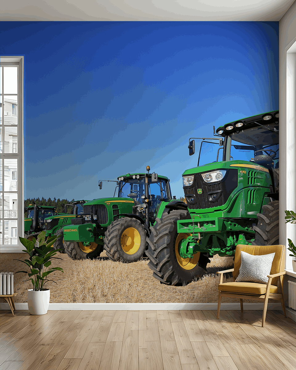 Breng de kracht van de moderne landbouw in uw interieur met het fotobehang “Green Giants”. De dynamische compositie van een rij moderne John Deere-tractoren tegen een blauwe lucht legt de majestueuze uitstraling van machines en de kracht van het boerenwerk vast. Deze realistische scène straalt rust, harmonie met de natuur en geavanceerde technologie uit en geeft elke ruimte een uniek karakter.