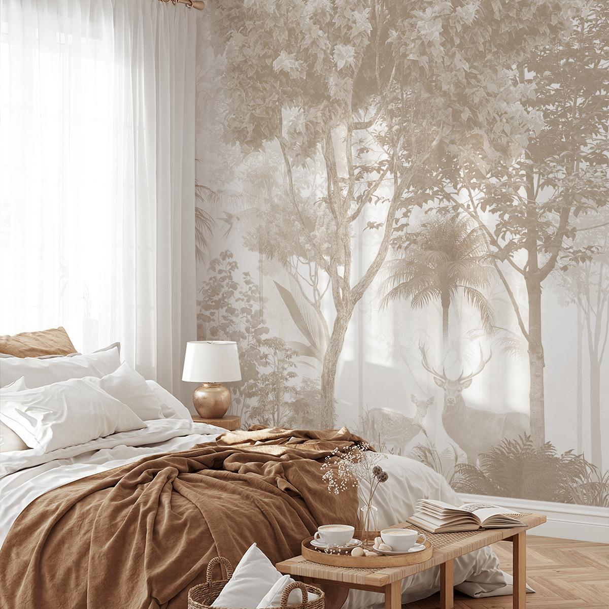 Breng een sfeer van rust en contemplatie in uw interieur met het fotobehang “Groen Grijs”. Deze sfeervolle compositie combineert subtiele tinten groen en grijs en creëert een beeld van een bos vol mysterie en vrede. De delicate mist, het diffuse licht en het silhouet van een hert geven het geheel een schilderachtig karakter en brengen de aura van de natuur in de kamer alsof u het door een droom ziet.