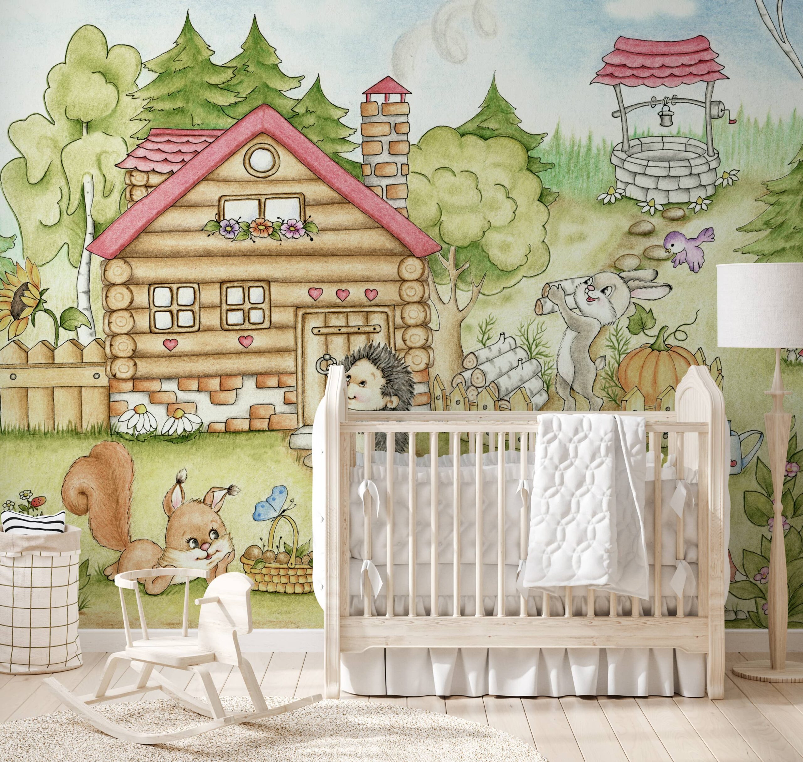 Breng een vrolijke sfeer in de kinderkamer met de muurschildering “Huis tussen de bomen”. Deze charmante illustratie toont een gezellig huisje omringd door groene bomen, een eekhoorn, een haas en een egel, die uitnodigen om samen te spelen in een bos vol bloemen en avonturen. Heldere kleuren en delicate details creëren een warme, sprookjesachtige sfeer, perfect voor de jongste dromers en ontdekkers.