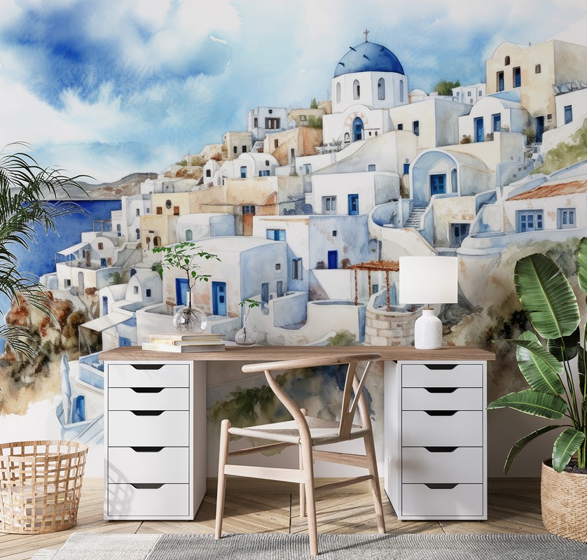 Het fotobehang “Idyllisch Griekenland” is een pittoreske decoratie die de zorgeloze sfeer van mediterrane landschappen in uw interieur brengt. Idyllische uitzichten op witte huizen, een blauwe zee en een pastelkleurige lucht creëren een ongelooflijk ontspannende en serene compositie. Perfect voor een woonkamer, eetkamer, kantoor of ontspanningsruimte, het brengt een aura van vakantievreugde, elegantie en tijdloze charme. Dit fotobehang is een aanrader voor wie waarde hecht aan reizen, een lichte stijl en artistieke inspiratie – “Idyllisch Griekenland” brengt de verfijning, stralende sfeer en elegantie van mediterraan design in uw interieur.