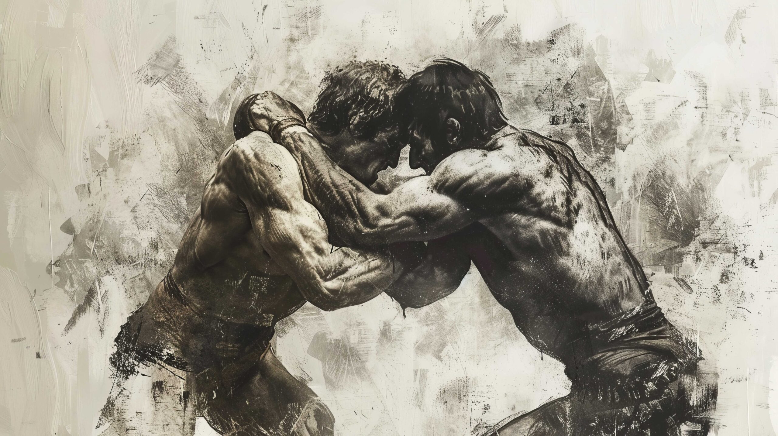 Breng een unieke sfeer in huis met het fotobehang “In de Omhelzing van de Strijd”. Dit ontroerende zwart-witmotief toont twee worstelaars in een intense strijd, die kracht, vastberadenheid en passie uitstralen. De expressieve compositie, geïnspireerd op klassieke sportschetsen, benadrukt de kracht van het menselijk lichaam en de vechtlust, en creëert een uniek accent in elke ruimte.