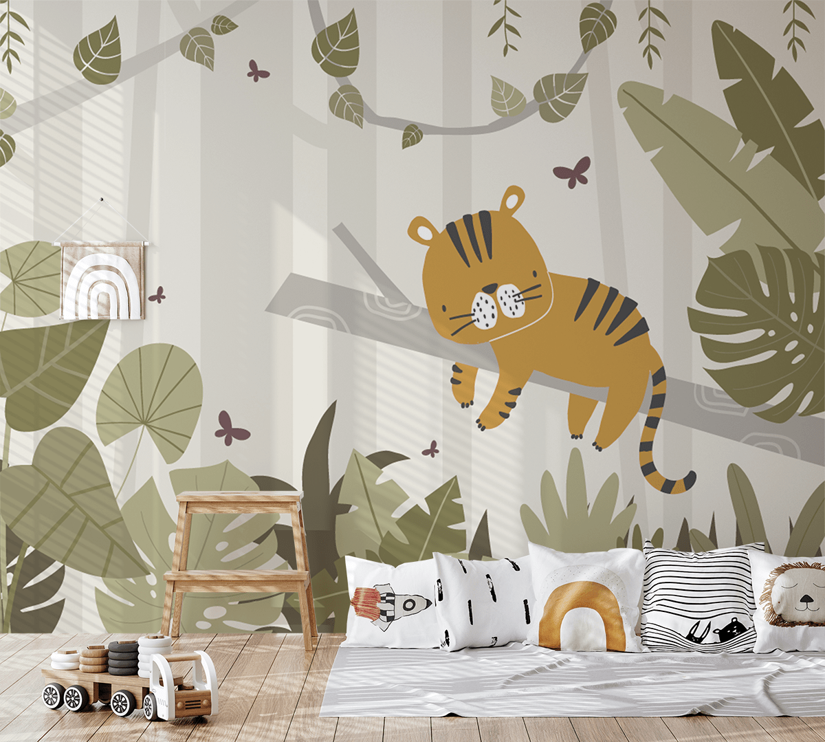 Breng een magische wereld naar de kinderkamer met het fotobehang “Kleine Tijger in het Groene Bos”. Deze charmante, kleurrijke afbeelding toont een kleine tijger die rust op een tak, omringd door groene bladeren en vlinders, waardoor een vriendelijke en vredige sfeer vol avontuur en plezier ontstaat. De delicate kleuren en het aangename patroon maken dit fotobehang perfect geschikt voor kinderkamers, kleuterscholen of speelruimtes.
