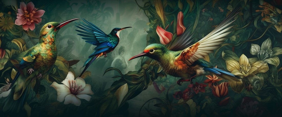 Behang “Kolibriedans in de jungle” – exotische lichtheid, kleurrijke dynamiek en de magische charme van de natuur