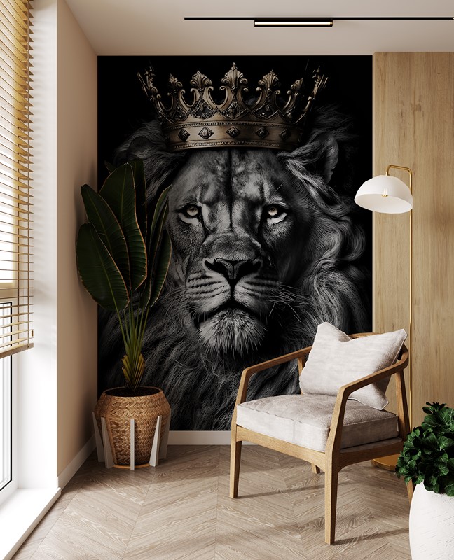 Fotobehang “Leeuw met een Gouden Kroon” – majesteit, kracht en koninklijke elegantie in uw interieur