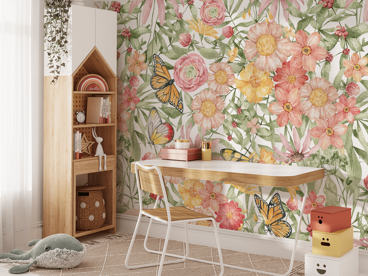 Dompel jezelf onder in een wereld vol bloemen en kleuren met het fotobehang “Lentevleugels”. Dit heerlijke, delicate patroon met bloem- en vlindermotieven neemt je mee naar een vrolijke tuin, waar elk detail bruist van lente-energie. Charmante vlinders in pasteltinten, omringd door bloemen in verschillende kleuren, creëren een unieke, sprookjesachtige sfeer die elk interieur opfleurt.