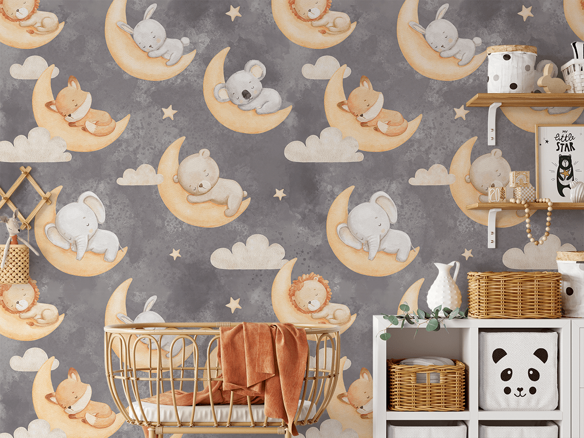 “Moon Cuddles” Fotobehang – Een betoverende wereld van dromen, zachtheid en kinderlijke magie in de kamer van je peuter