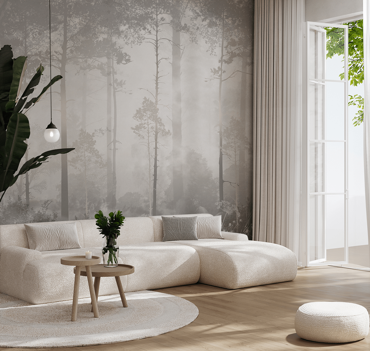 Breng een unieke sfeer in huis met het fotobehang “Misty Silence”. Dit delicate, monochrome patroon van een mistig bos roept een gevoel van rust en mysterie op en creëert een sfeer van kalmte en natuurlijke harmonie.