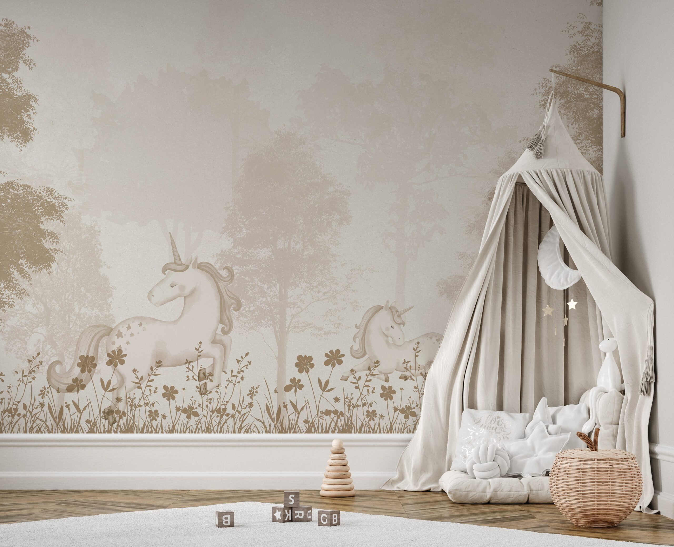 Breng een magische sfeer in de kinderkamer met de muurschildering “Mysterieus Eenhoornbos”. Dit delicate patroon in gedempte kleuren toont charmante eenhoorns die door een magisch bos dwalen tussen bloemen, bomen en bosvegetatie. De subtiele illustratie creëert een kalme, dromerige sfeer, perfect om te ontspannen en te dromen.