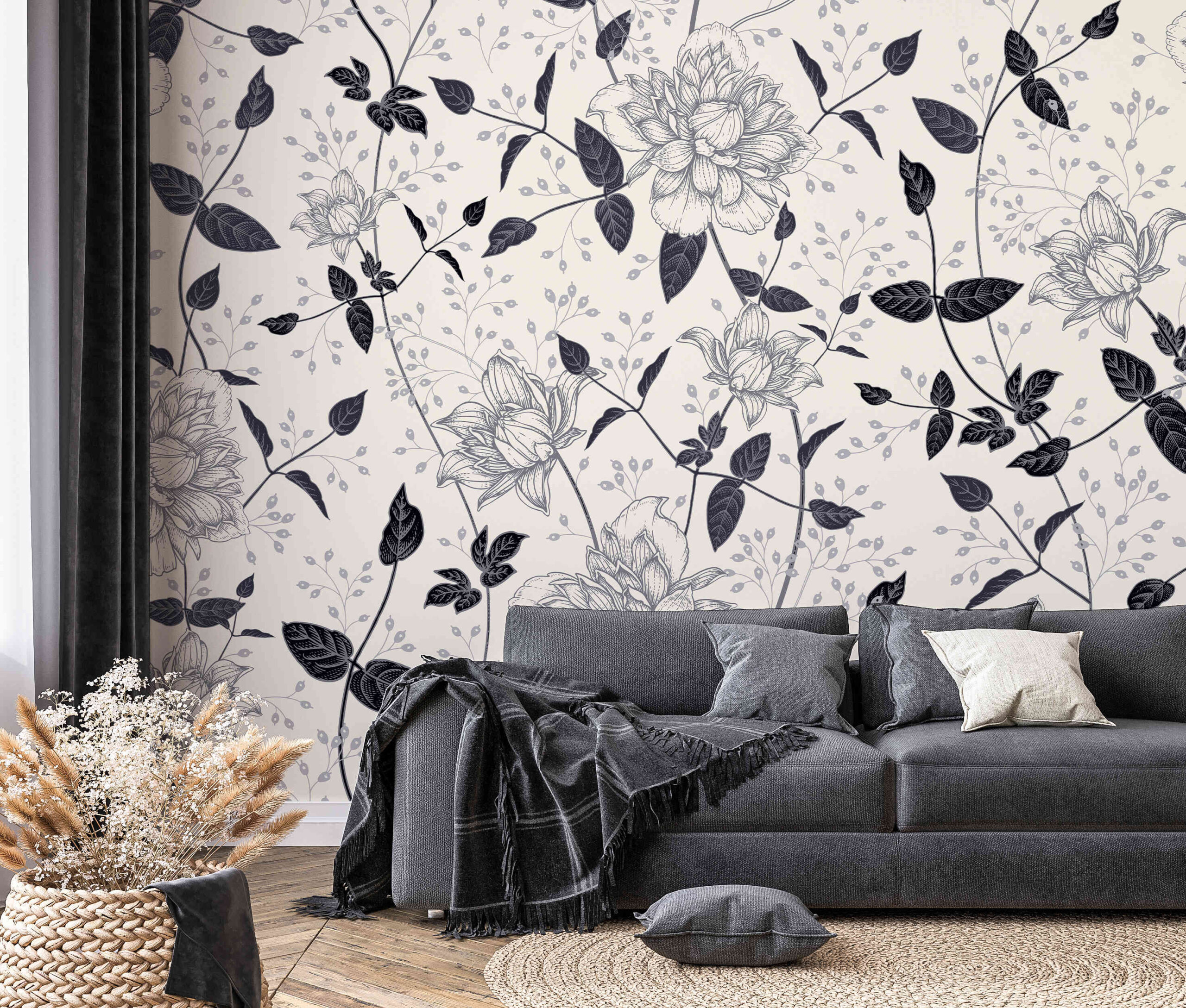 Fotobehang “Night Petals” is een uniek patroon dat klassieke elegantie combineert met de delicate schoonheid van natuurlijke bloemmotieven. Het zwart-witte, gedetailleerde patroon doet denken aan handgetekende botanische gravures en brengt rust, harmonie en een tijdloze stijl in het interieur. Deze muurschildering is ideaal voor woonkamers, slaapkamers, kantoren en commerciële ruimtes en past zowel bij moderne als klassieke interieurs, waardoor een verfijnd karakter en subtiele decoratie worden toegevoegd. Dit is een voorstel voor liefhebbers van natuurlijke esthetiek en minimalistische elegantie die een unieke sfeer vol verfijning en stijl in hun huis willen creëren. Kies deze muurschildering om uw interieur een uniek, botanisch accent te geven.