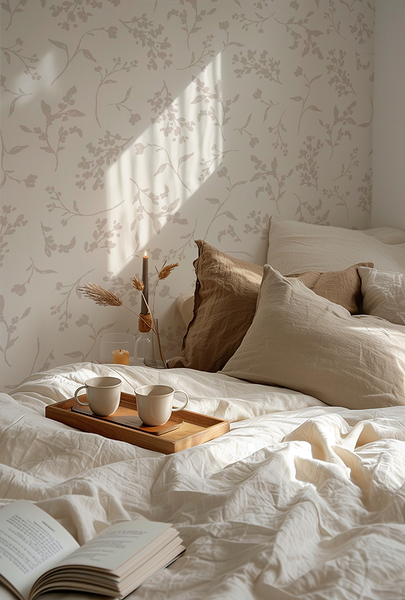 Dit behang is een aanrader voor wie op zoek is naar harmonie, gezelligheid en subtiele decoratie geïnspireerd door de natuur. Het past perfect in lichte, Scandinavische interieurs en romantische cottage- of boho-stijl arrangementen.