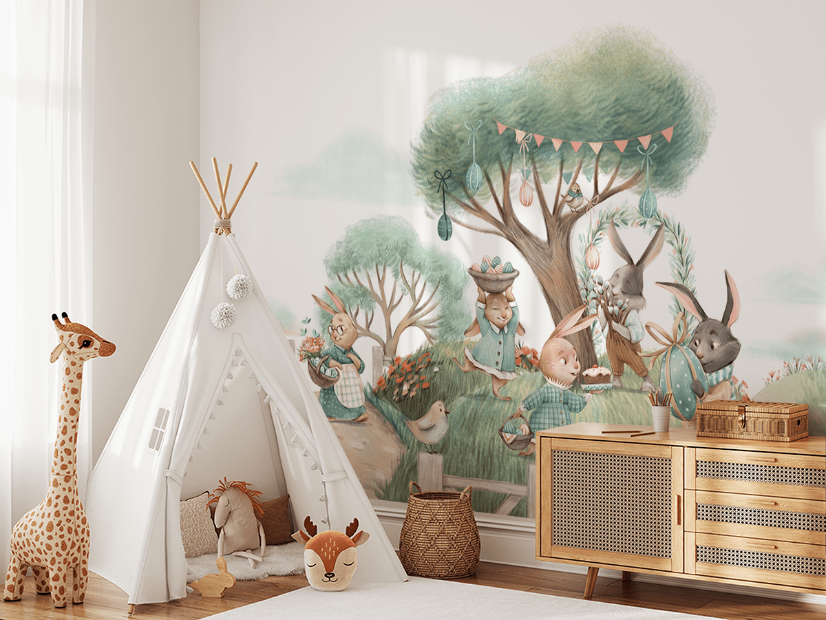 “Paashaasjes” Fotobehang – Vrolijke lente, kleurrijke details en een charmante decoratie voor een kinderkamer