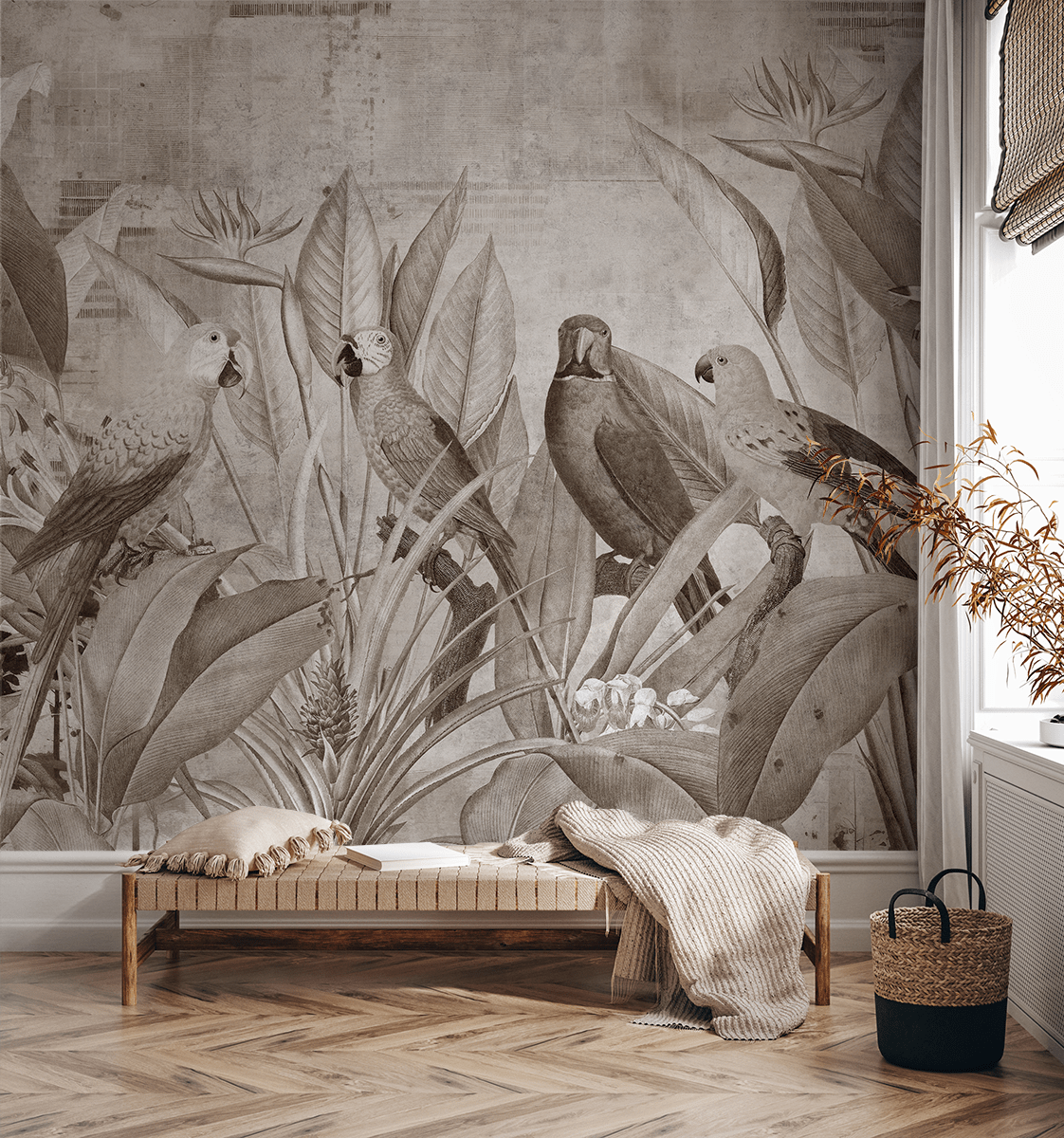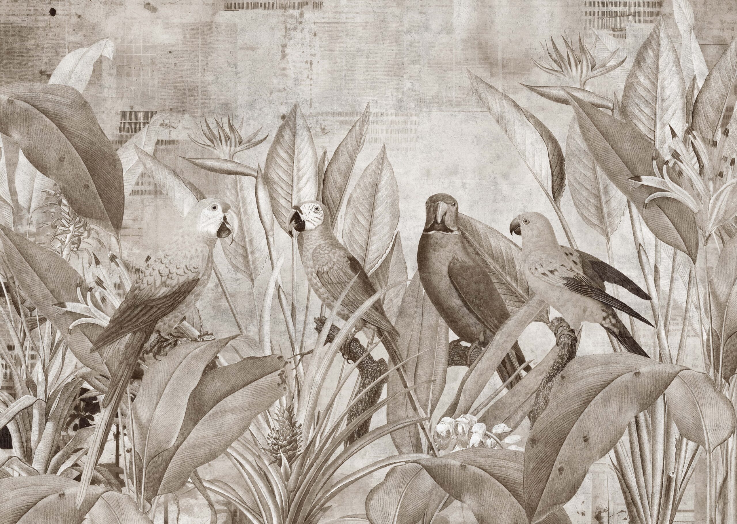 Creëer een unieke sfeer in uw huis met het fotobehang “Paradise Meeting”. Dit gedetailleerde, sepia-getinte motief van papegaaien omringd door weelderige, tropische vegetatie roept de sfeer van een exotische jungle op en voegt warmte en natuurlijke elegantie toe aan de ruimte. De precieze details van de vogels en bladeren passen perfect in zowel klassieke als moderne interieurs.