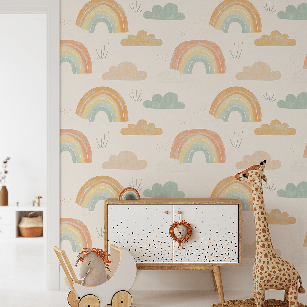 Creëer een warme en vriendelijke sfeer in de kinderkamer met het fotobehang “Pastel Dreams”. Dit subtiele patroon met pastelkleurige regenbogen en zachte wolken creëert een gezellige, vrolijke ruimte die spel en fantasie stimuleert. De heldere, zachte kleuren passen perfect bij kindermeubels en -accessoires, waardoor het interieur een licht en vrolijk karakter krijgt.