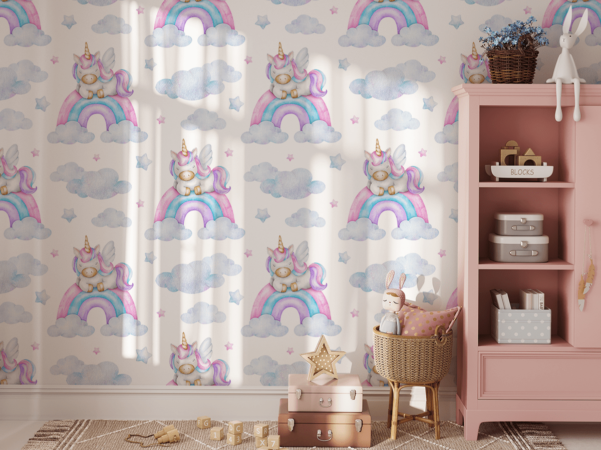 Neem je kind mee naar een wereld vol kleuren en fantasie met het fotobehang “Rainbow Stop”. Charmante eenhoorns die rusten op zachte regenbogen, omringd door pluizige wolken en fonkelende sterren, creëren een unieke, vriendelijke sfeer in de kamer die de verbeelding stimuleert en veel positieve energie toevoegt.