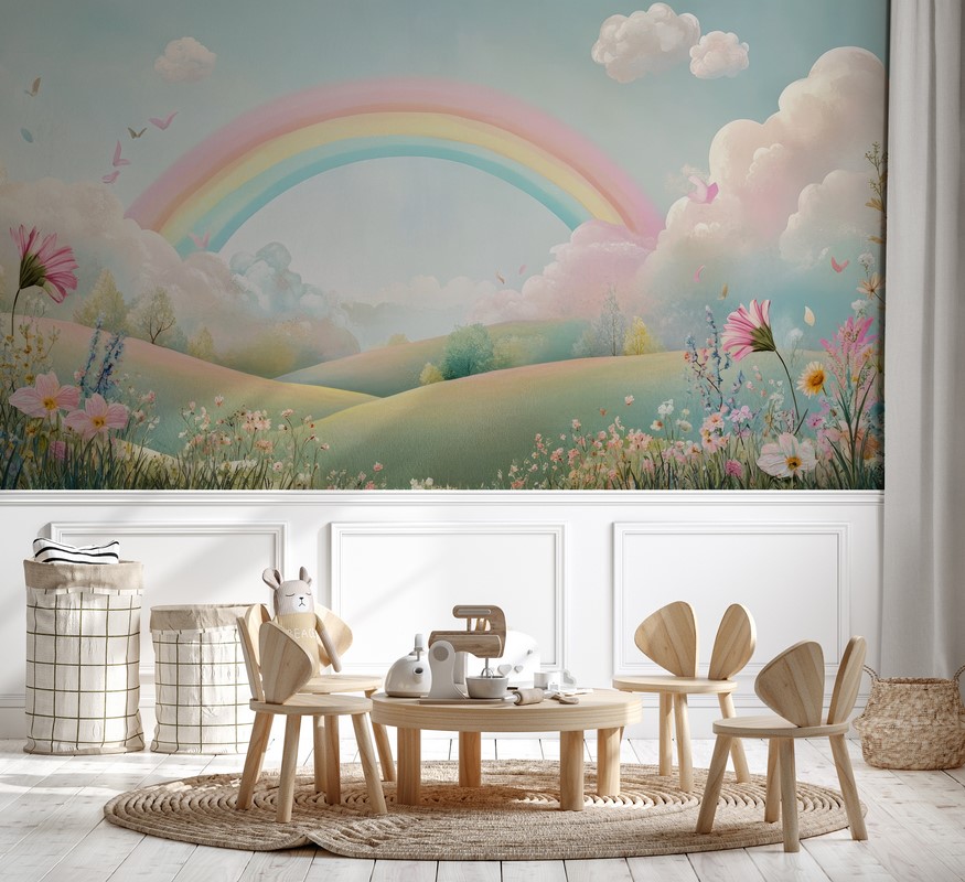 Het fotobehang “Regenboogparadijs in de Weide” is een schilderachtige compositie die uw interieur meeneemt naar het hart van een bloeiende weide vol kleur en licht. De zorgvuldig gerangschikte pastelkleurige bloemen – variërend van lichtroze tot paars en crème – vormen een levendig, uniek muurschildering die doet denken aan een impressionistische tuin. De poedergroene achtergrond versterkt het gevoel van natuurlijkheid, frisheid en ruimte. Perfect voor een kinderkamer, het creëert een sfeer van rust, artistieke elegantie en de subtiele energie van de natuur. Dit behang is een aanrader voor wie waarde hecht aan decoraties geïnspireerd door flora, schilderachtige esthetiek en interieurs vol delicate harmonie.