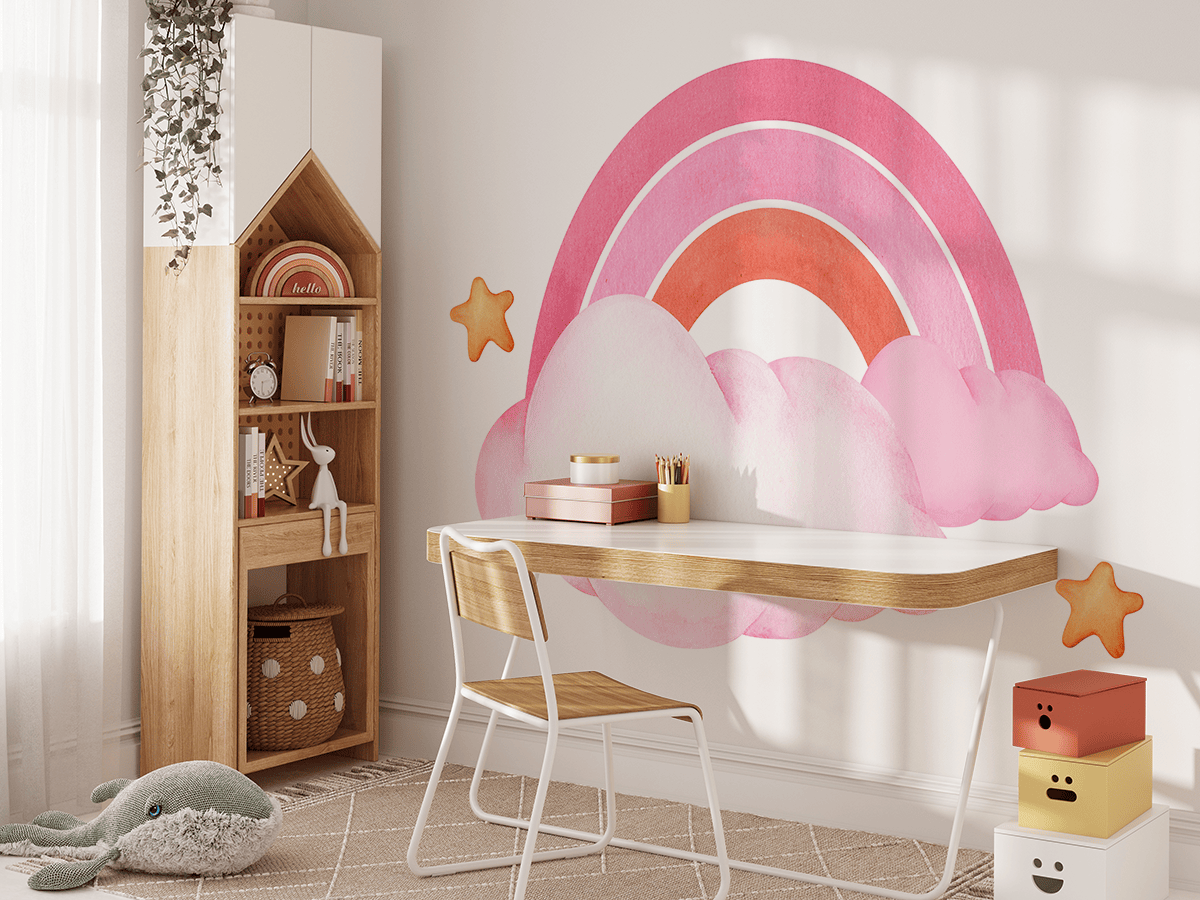 Fotobehang “Roze Droomland” – de zachtheid van pastelkleurige wolken, de charme van een roze regenboog en magische sterren creëren een kinderwereld vol warmte en fantasie.