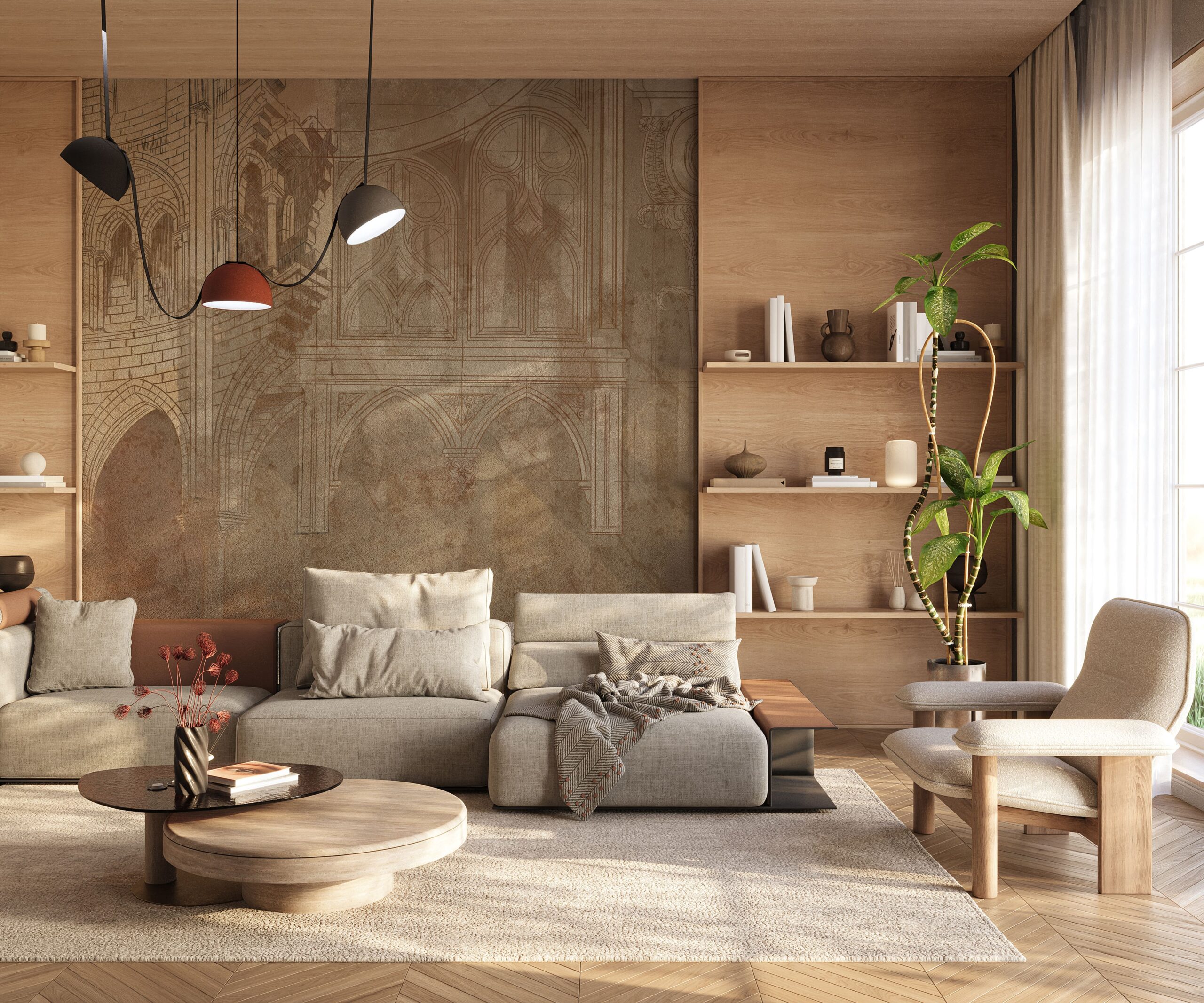 Fotobehang “Gothic Outline” – rauwe elegantie, historische sfeer en architectonische finesse van het interieur