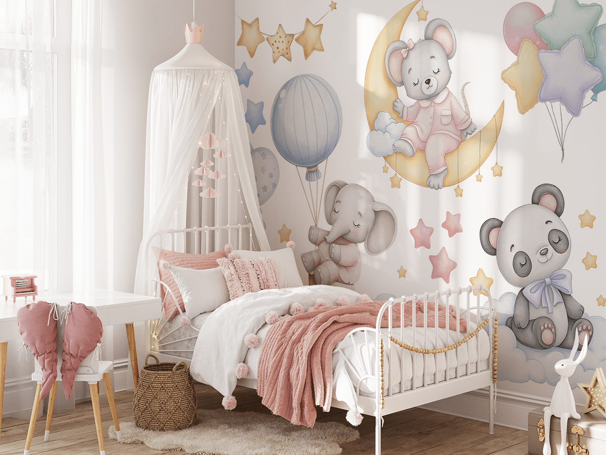 Breng een sfeer van rust en tederheid in de kinderkamer met het fotobehang “Slaperige Dieren”. Deze unieke illustratie toont schattige, slapende dieren – een muis op de maan, een olifant in een ballon en een teddybeer op een wolk – omringd door pastelkleurige sterren, ballonnen en zachte wolken. Subtiele kleuren en vriendelijke figuren creëren een harmonieuze, rustgevende ruimte, perfect om te rusten en te dromen.