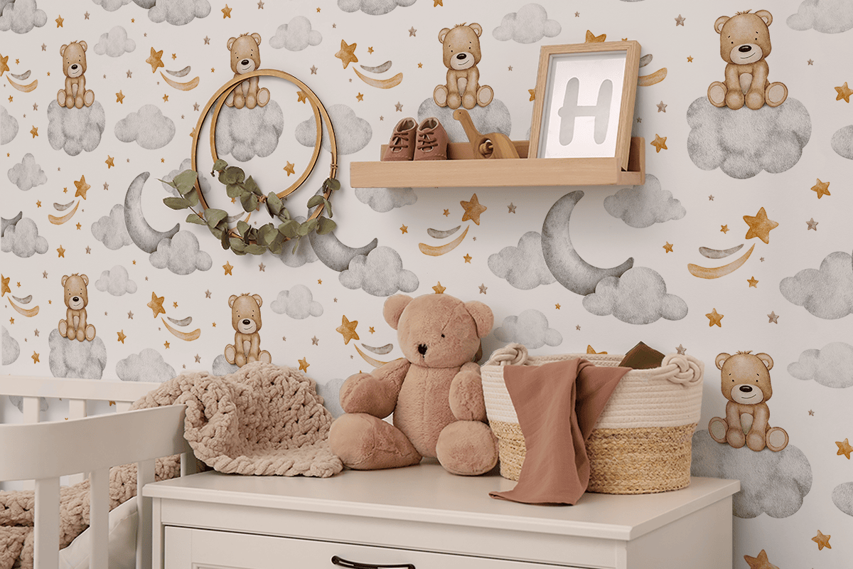 Behang “Teddybeer op een wolk” – een betoverende wereld van dromen en kinderlijke fantasie