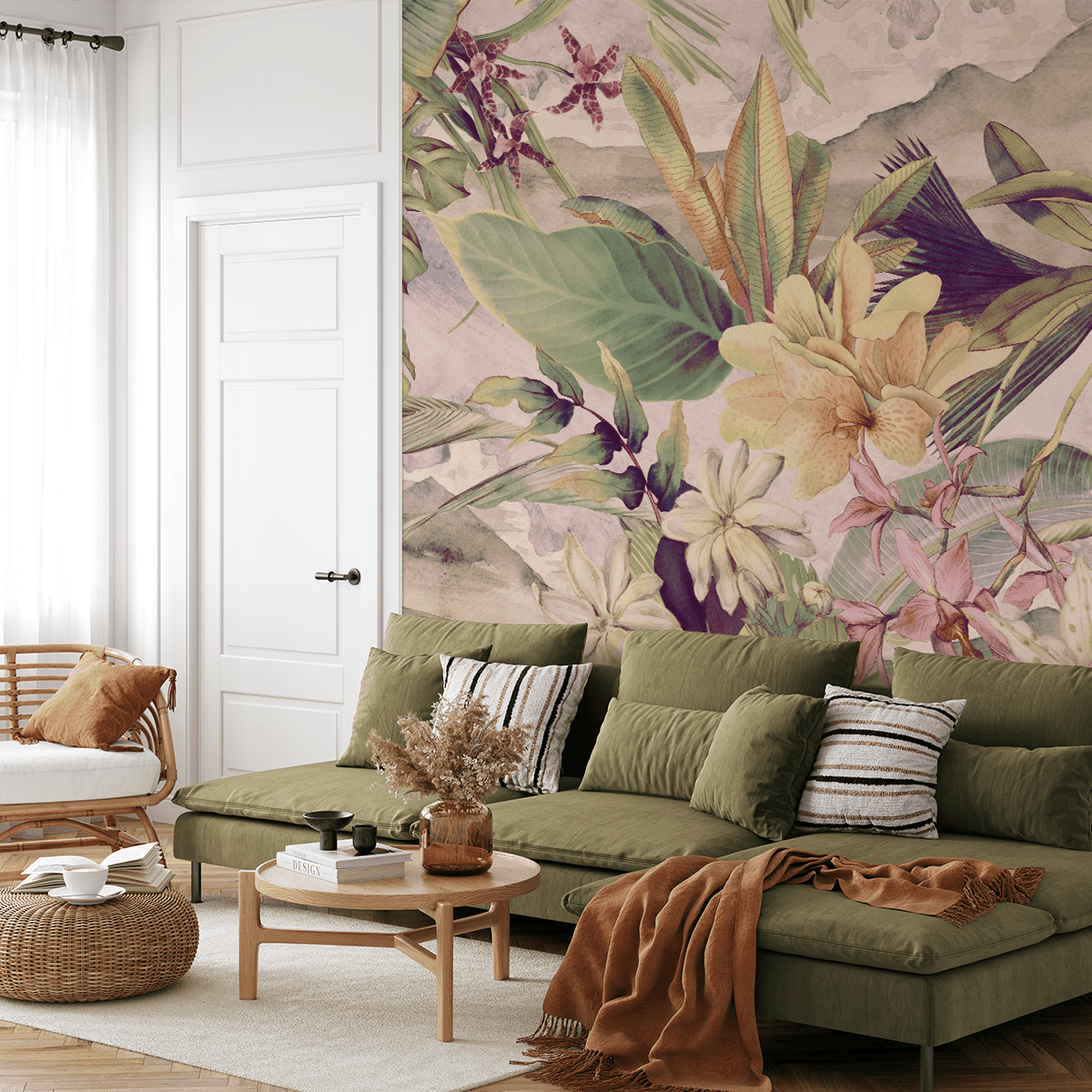 Breng een unieke sfeer in huis met het “Tropical Harmony” fotobehang. Dit zorgvuldig vervaardigde, pastelkleurige plantenpatroon combineert de exotische lichtheid en delicate schoonheid van tropische bloemen en bladeren, waardoor een ruimte vol rust en harmonie ontstaat. Subtiele kleuren en verfijnde details maken dit fotobehang perfect geschikt voor zowel moderne als klassieke interieurs.
