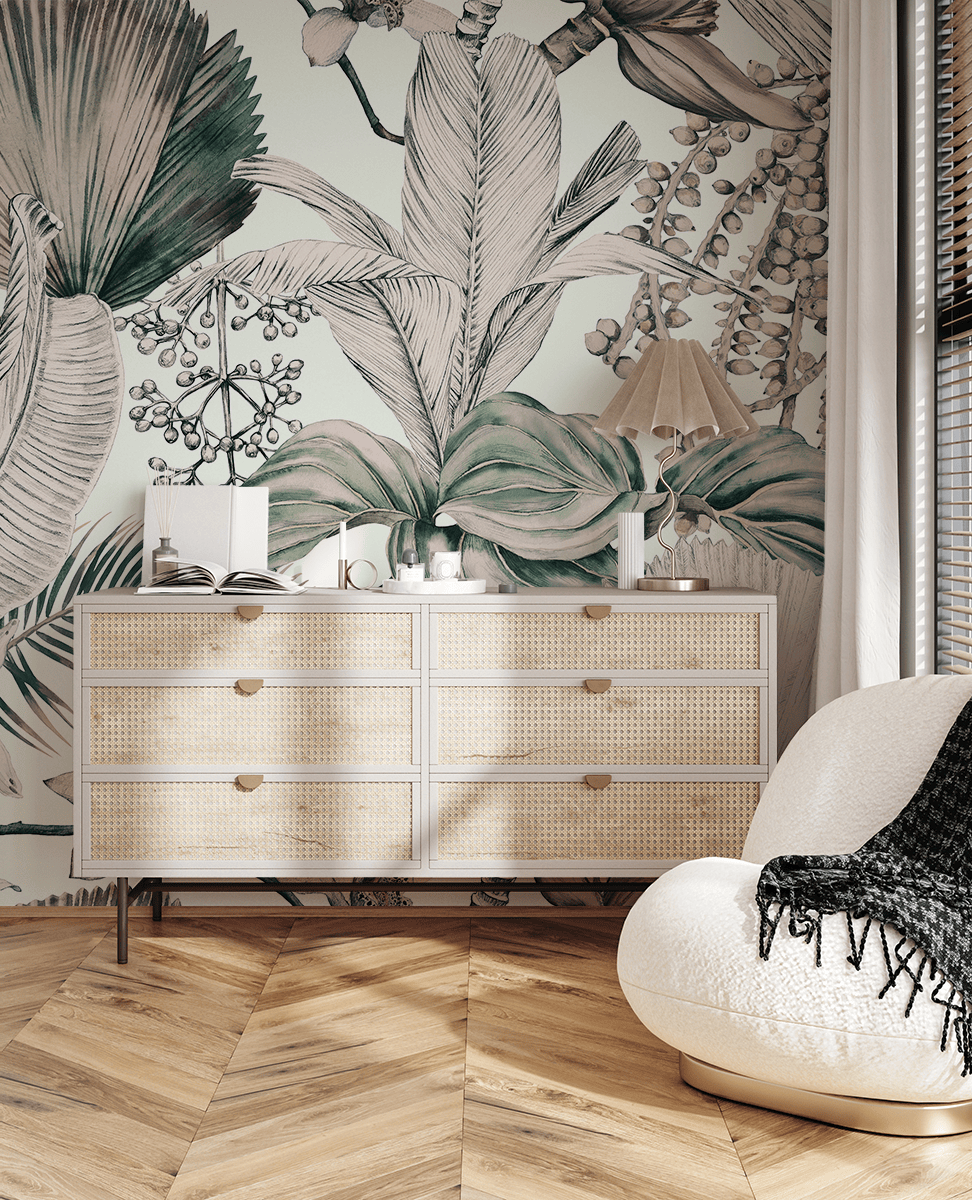 Een fotobehang is niet zomaar een decoratie – het is een compositie geïnspireerd door de natuur die rust, ritme en tropische charme uitstraalt en een unieke sfeer creëert in elke ruimte.